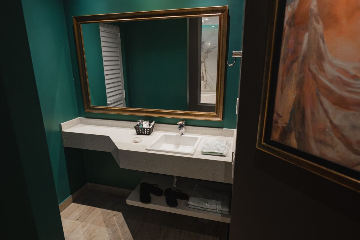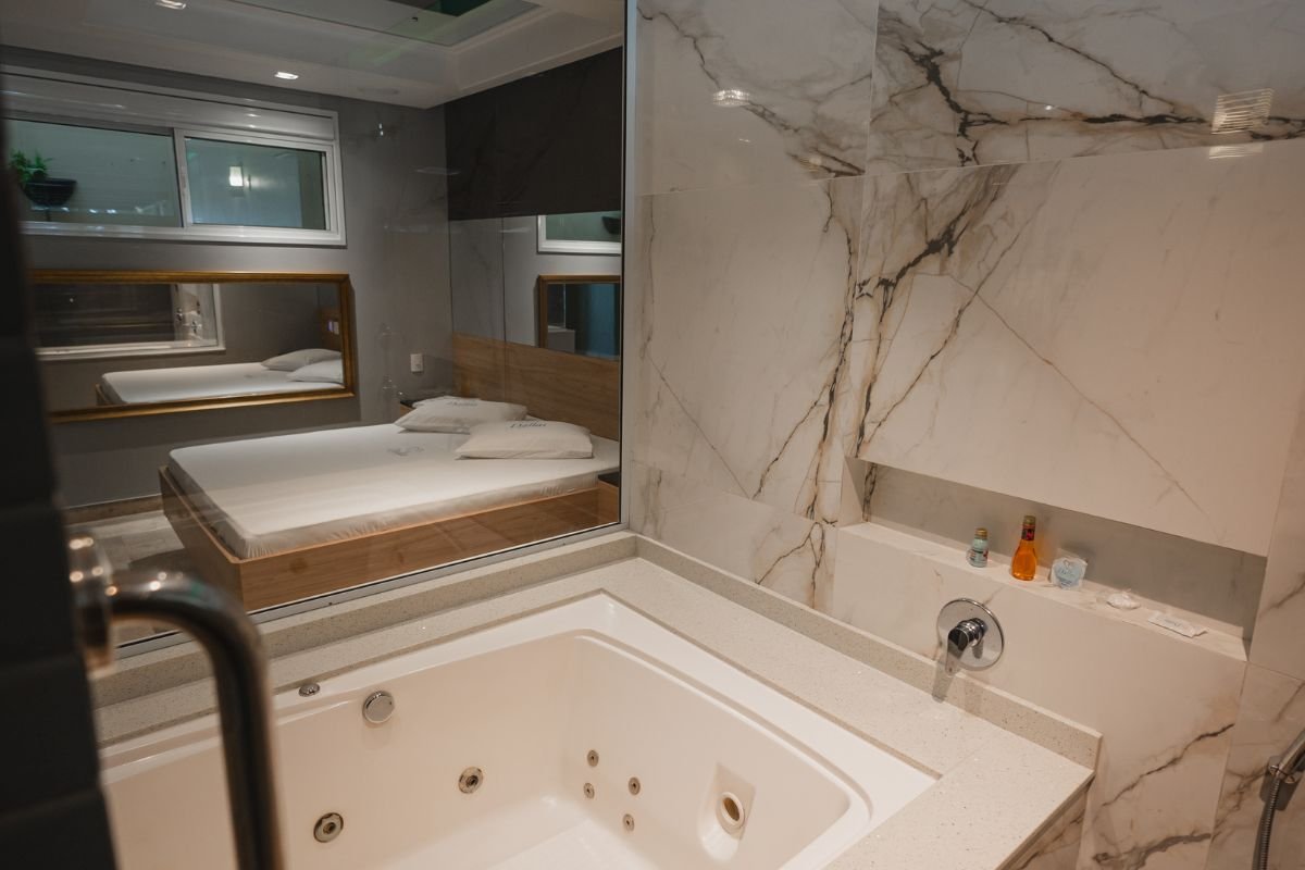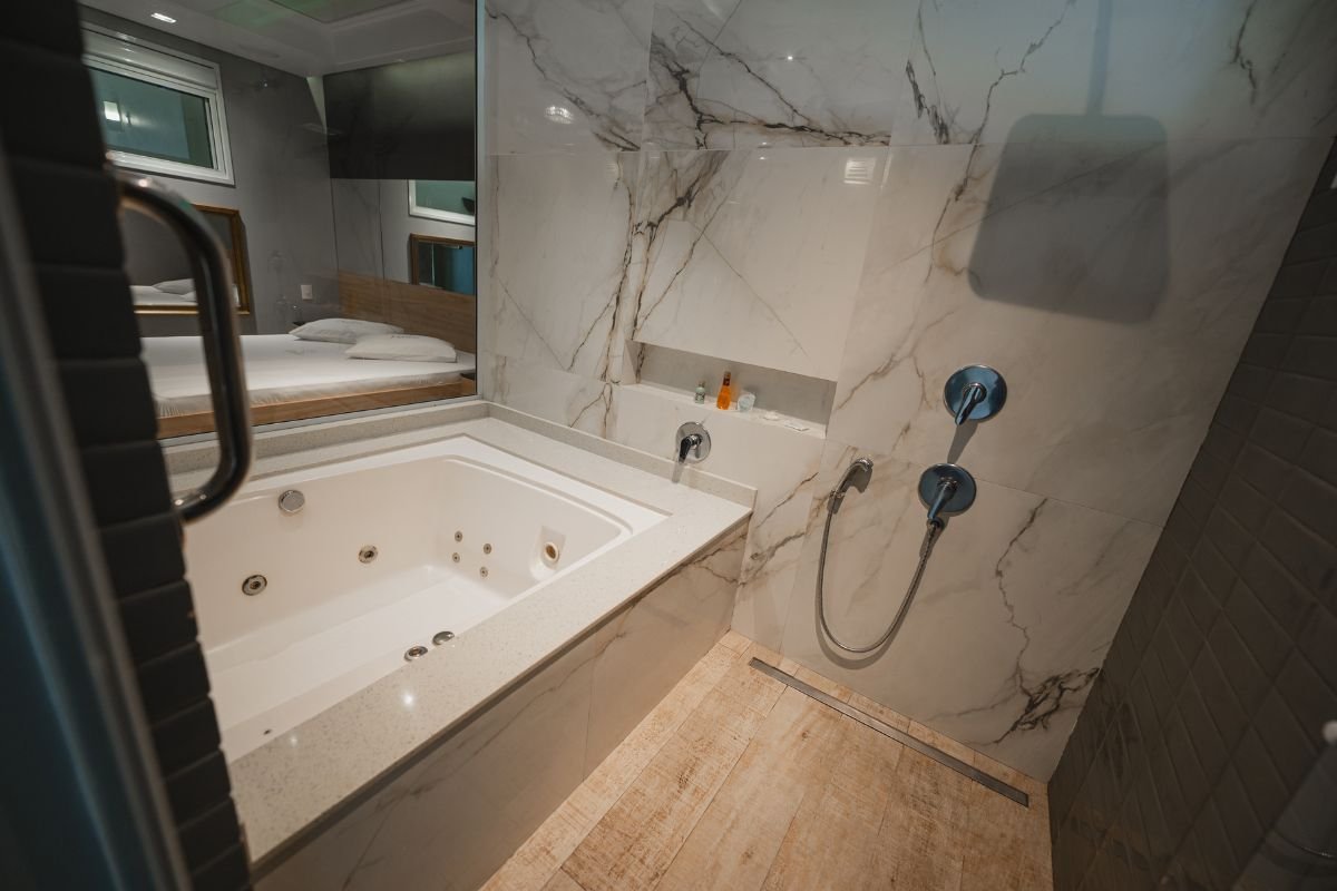 A hidromassagem de 1,20 x 1,80m é o destaque do ambiente, ideal para relaxar e viver momentos de puro prazer. O espelho no teto traz um toque de charme e sensualidade, enquanto o Wi-Fi gratuito garante conectividade durante a estadia.