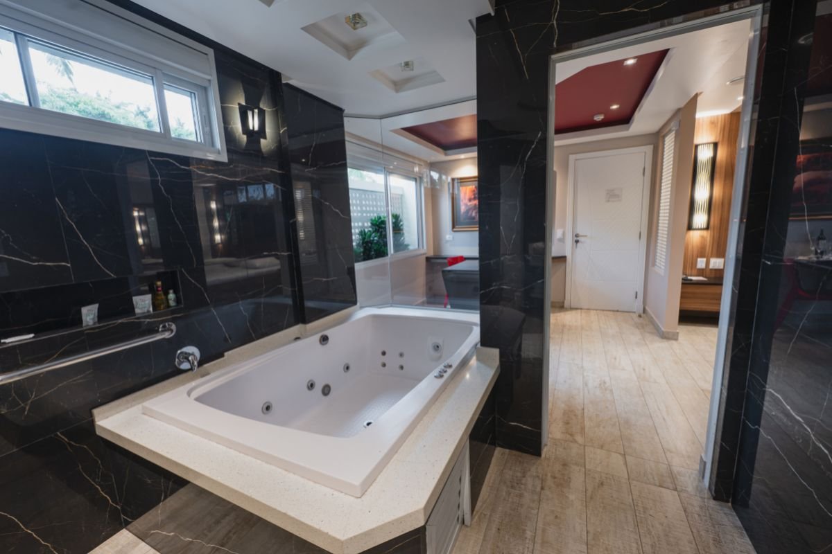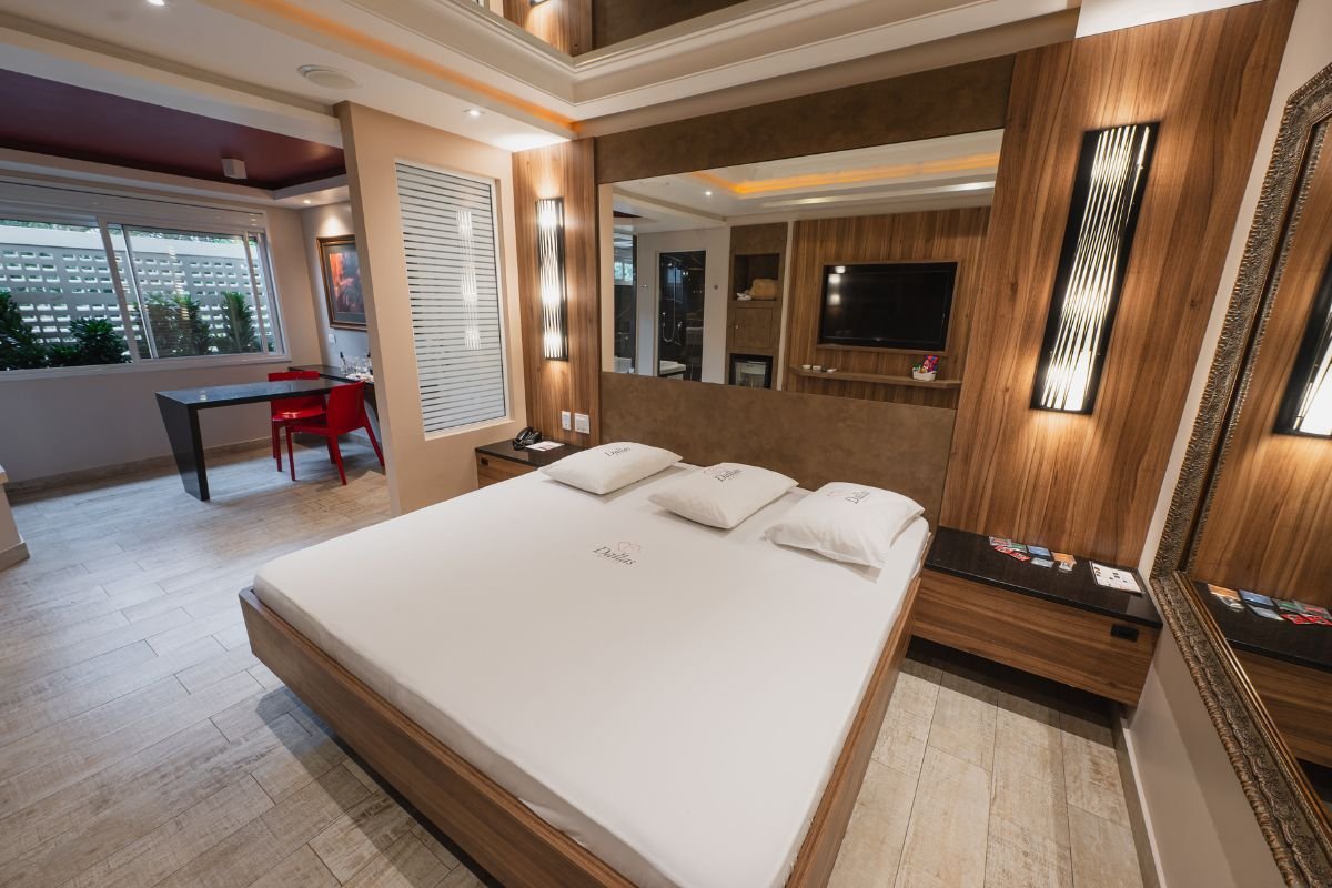 A cama king size oferece ampla liberdade de movimentos, e o espelho no teto acrescenta um toque de charme e sensualidade ao ambiente. Equipada com TV de 40 polegadas, frigobar, ar-condicionado e persianas motorizadas, permite climatização e a iluminação ideais para momentos de descanso.
