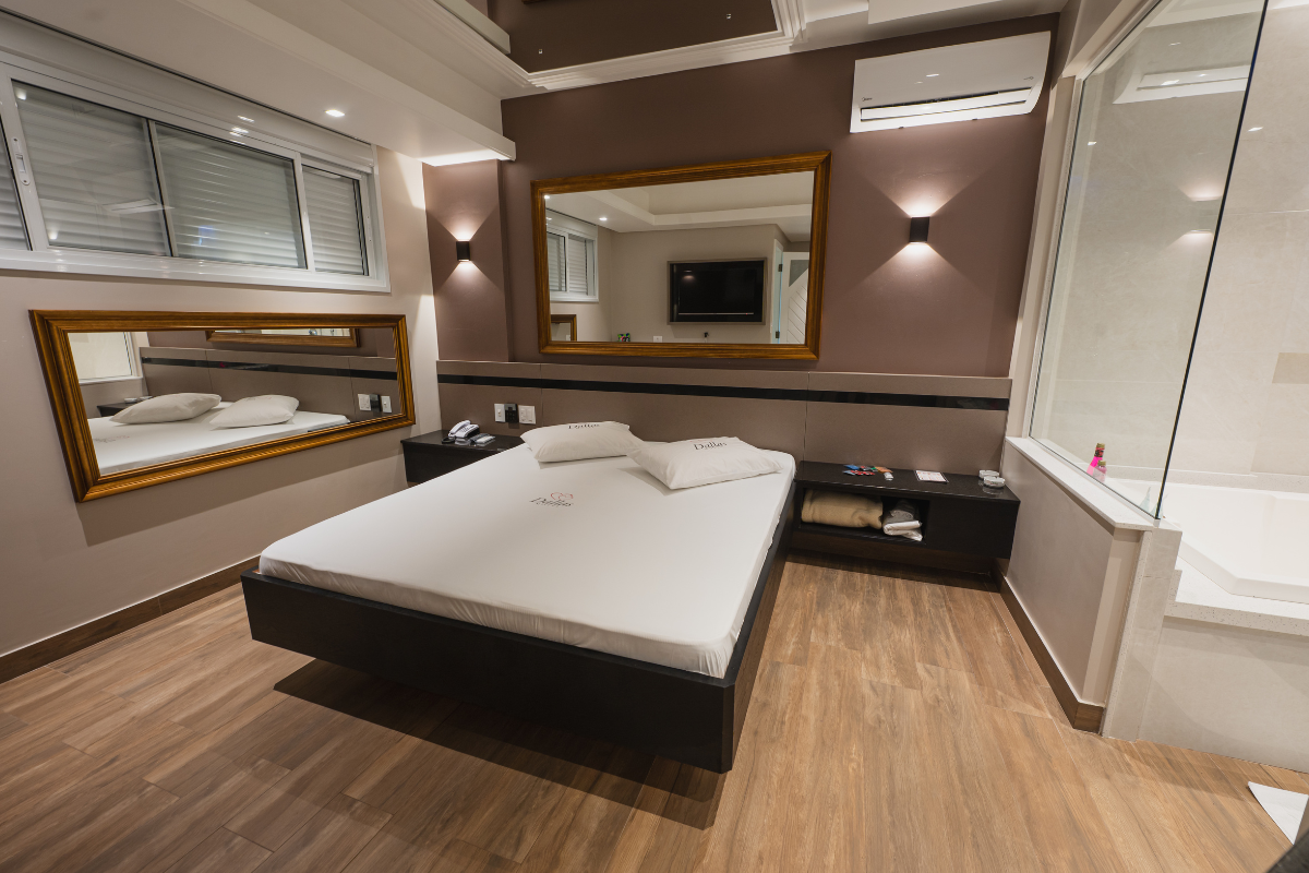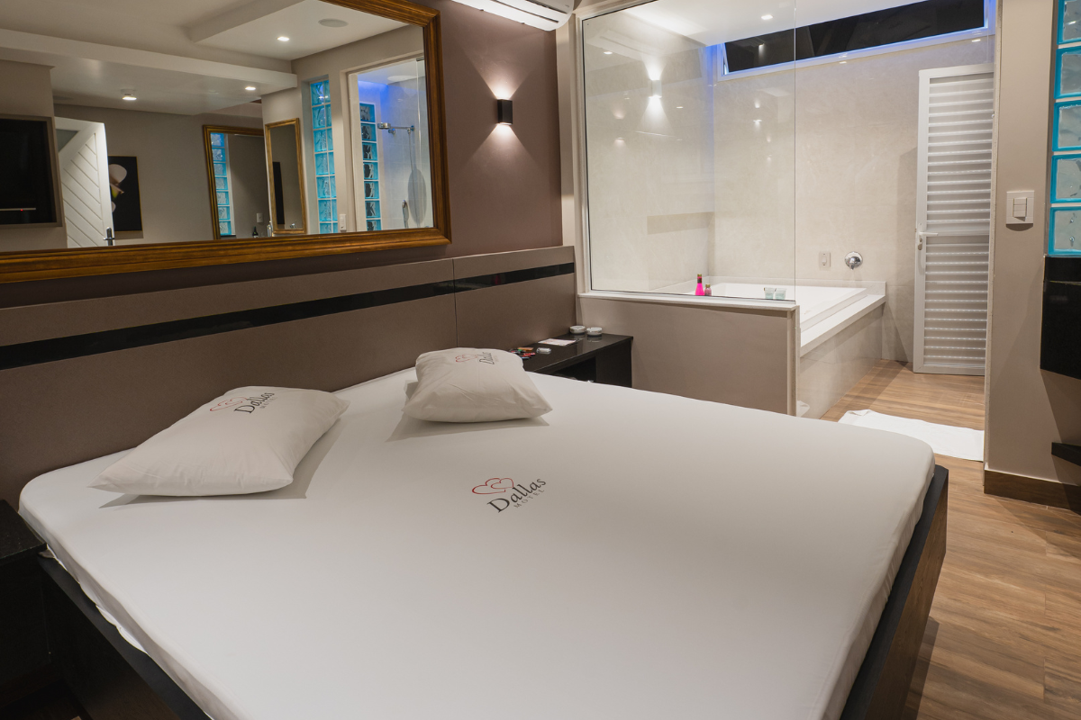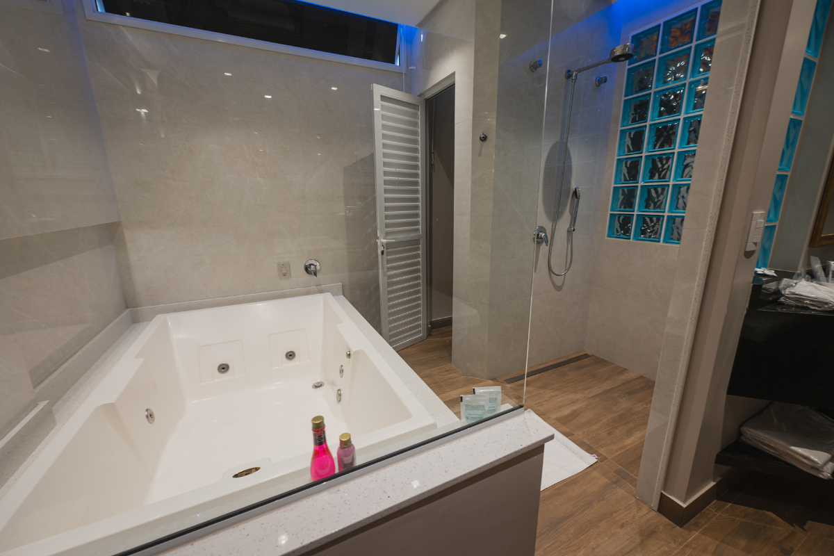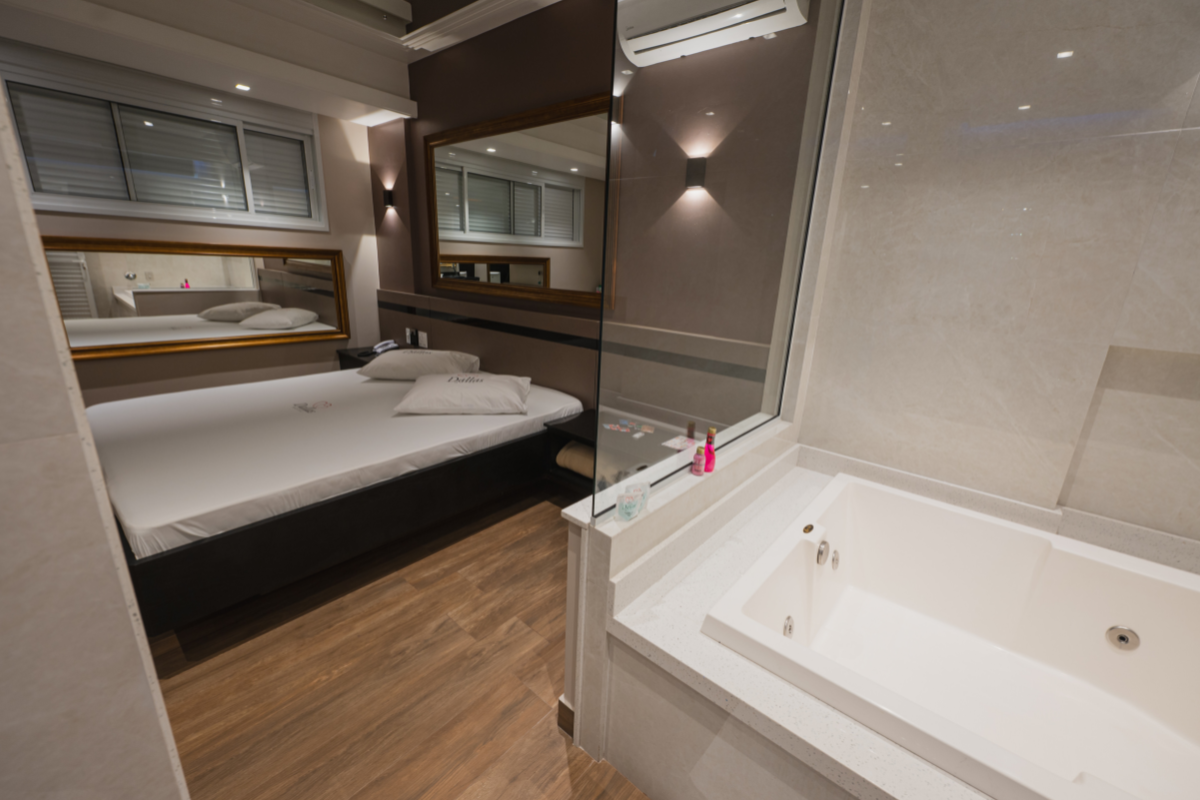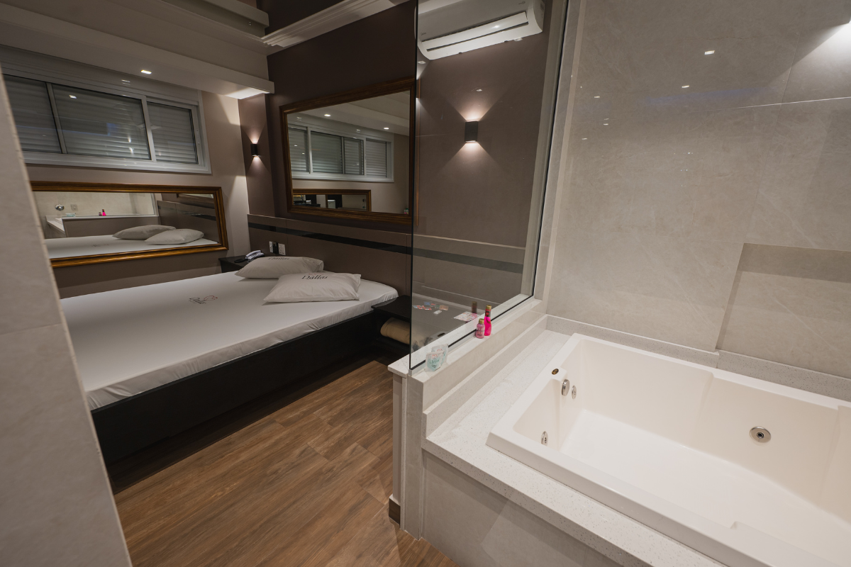 A hidromassagem é o ponto alto da suíte, ideal para relaxar e renovar as energias. O espelho no teto adiciona um toque de charme e sensualidade ao ambiente, enquanto o Wi-Fi gratuito e a garagem privativa completam a experiência com total conveniência e discrição.