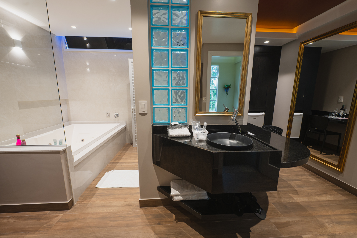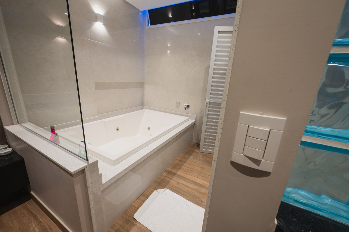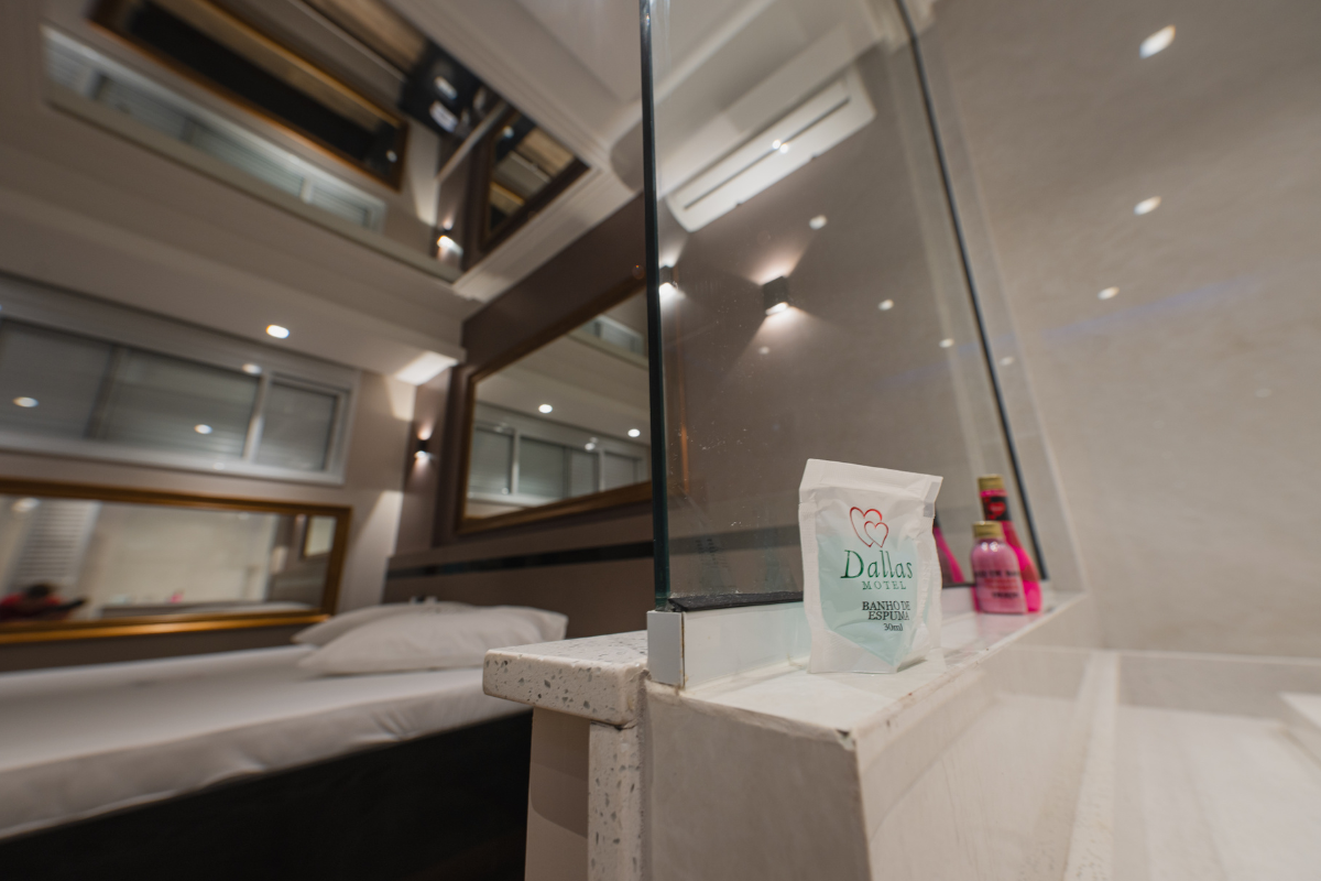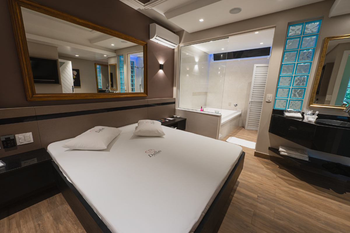 A hidromassagem é o ponto alto da suíte, ideal para relaxar e renovar as energias. O espelho no teto adiciona um toque de charme e sensualidade ao ambiente, enquanto o Wi-Fi gratuito e a garagem privativa completam a experiência com total conveniência e discrição.