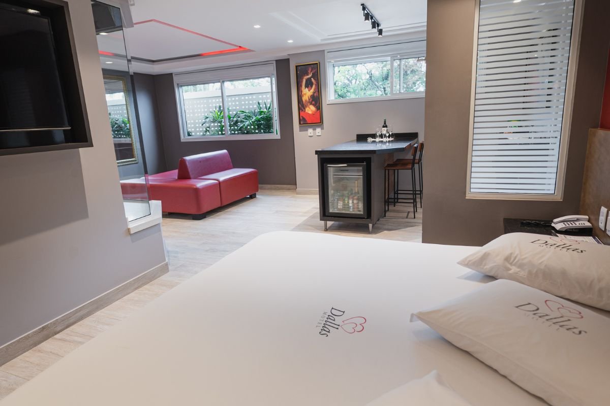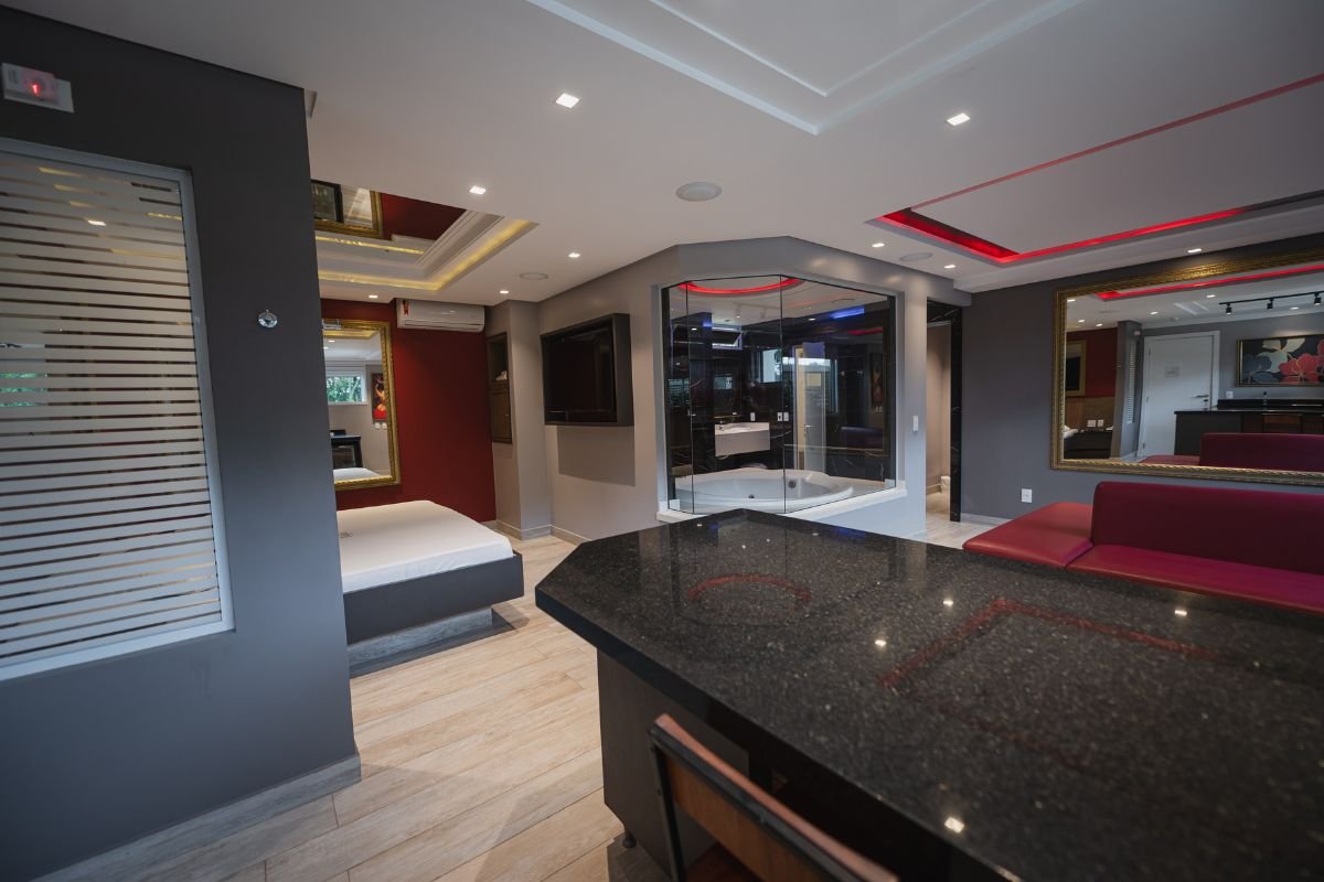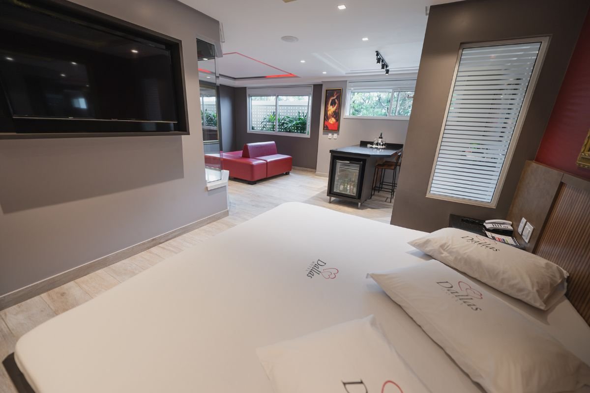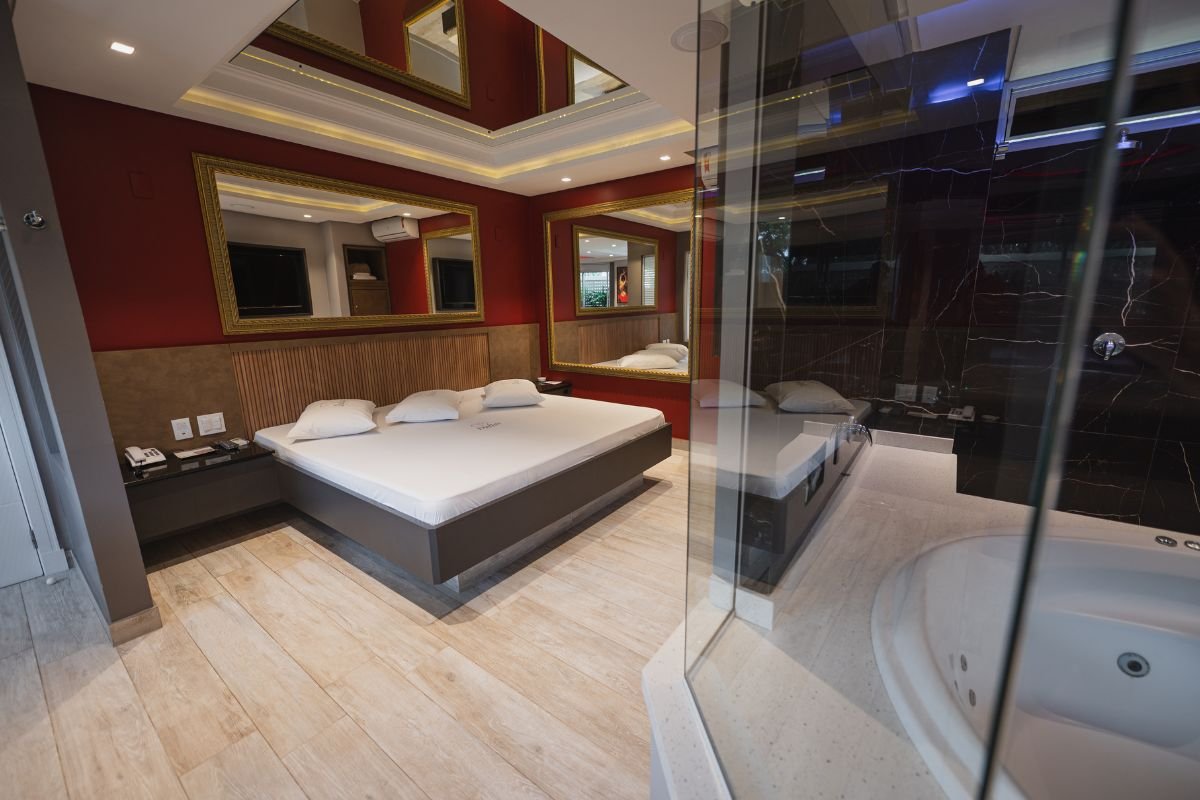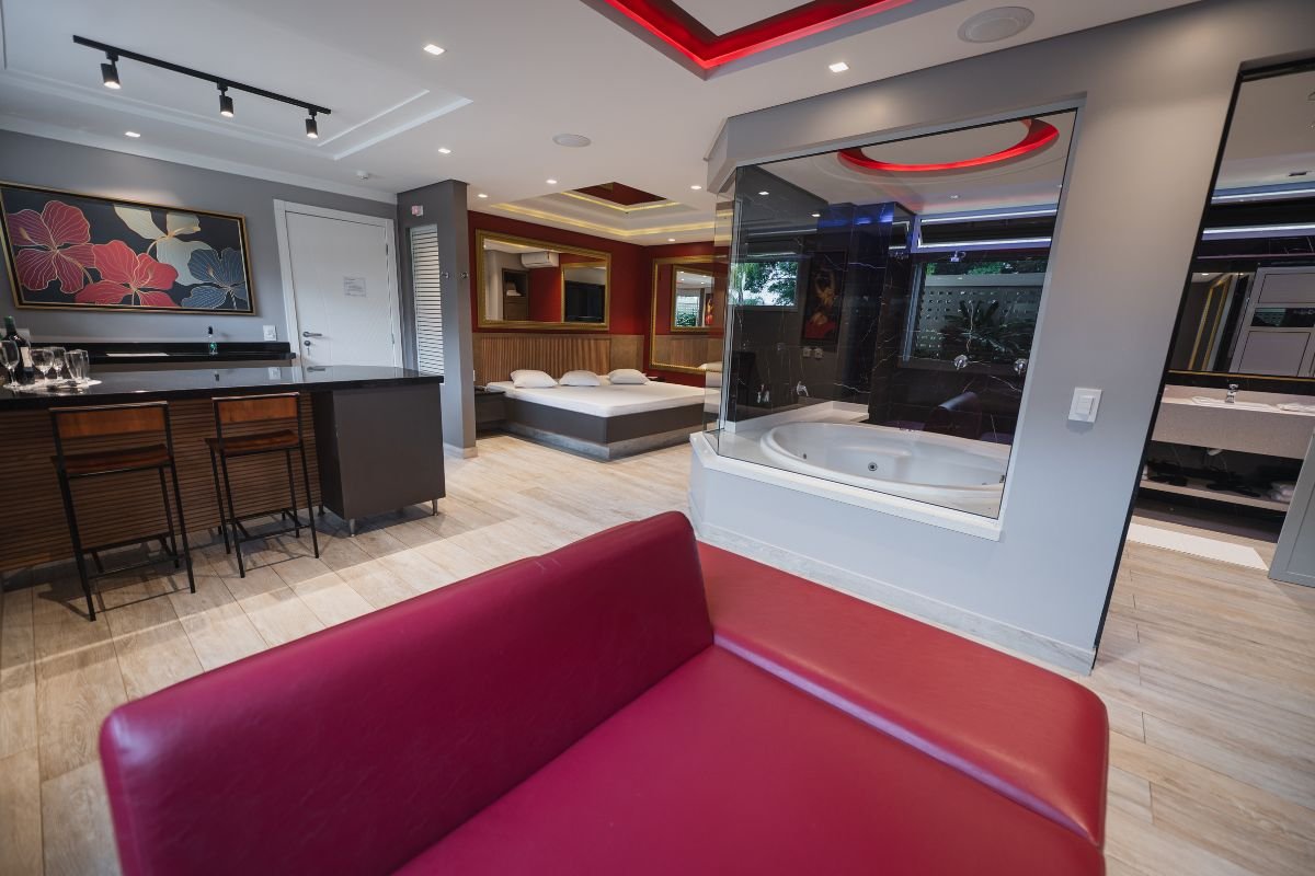 O ambiente conta com TV de 50 polegadas, frigobar, ar-condicionado e persianas motorizadas. Para completar, a suíte oferece Wi-Fi gratuito e garagem privativa, garantindo total bem-estar e discrição durante a estadia.