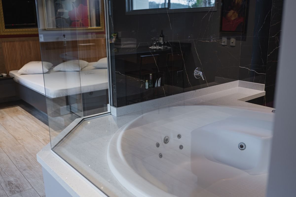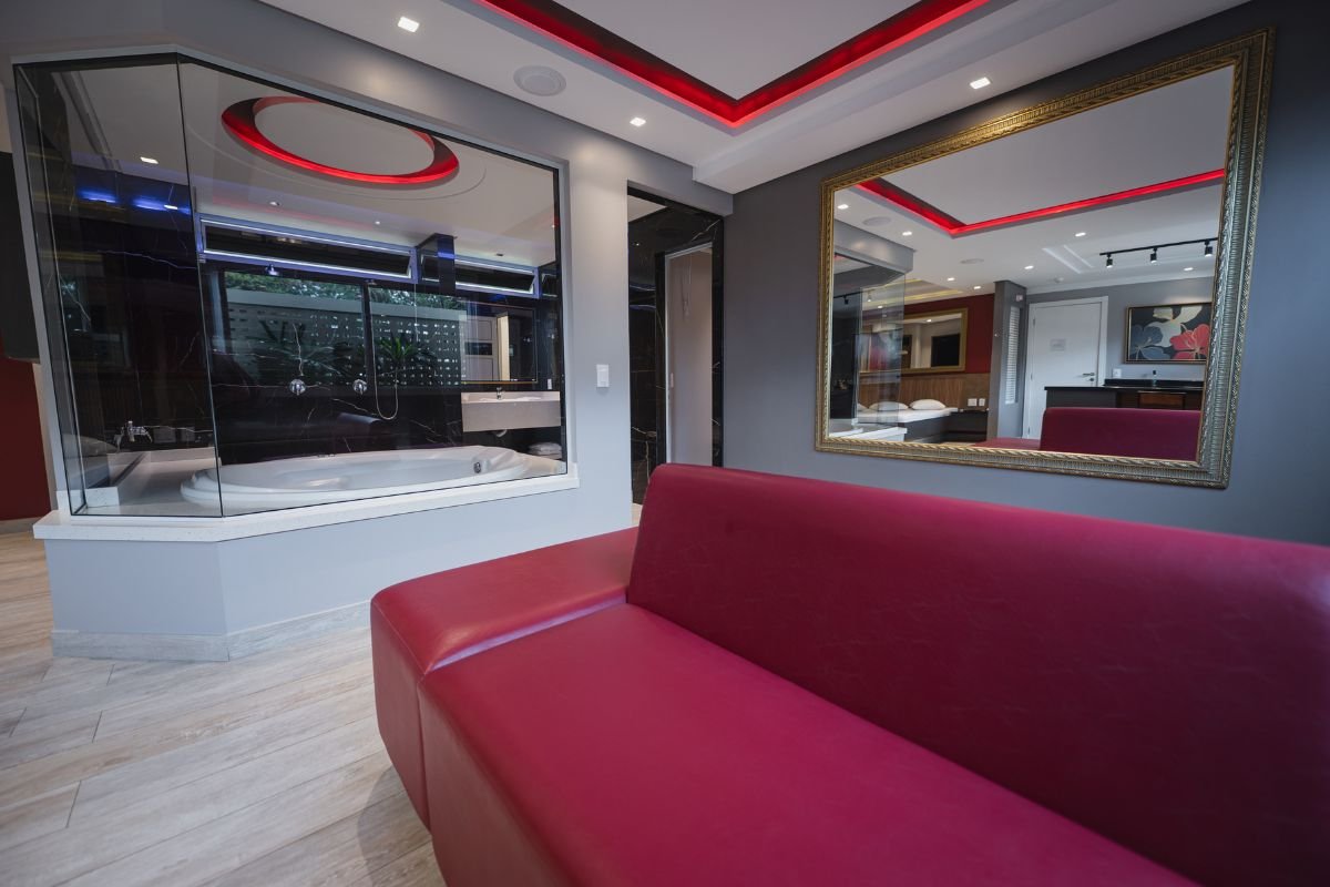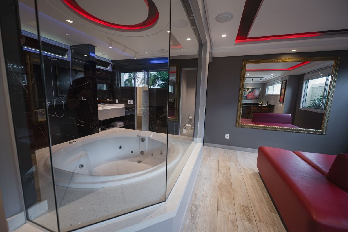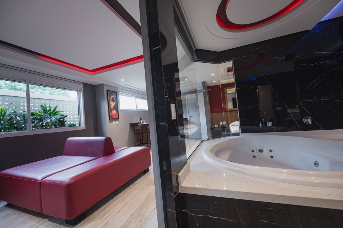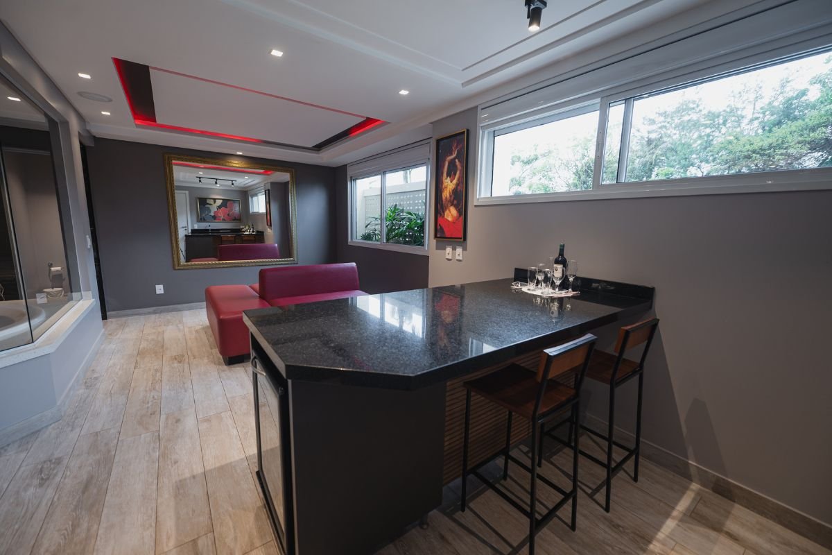 O ambiente conta com TV de 50 polegadas, frigobar, ar-condicionado e persianas motorizadas. Para completar, a suíte oferece Wi-Fi gratuito e garagem privativa, garantindo total bem-estar e discrição durante a estadia.
