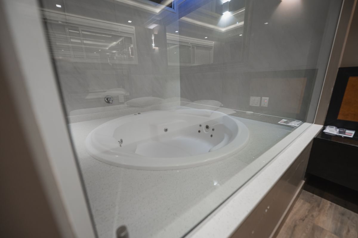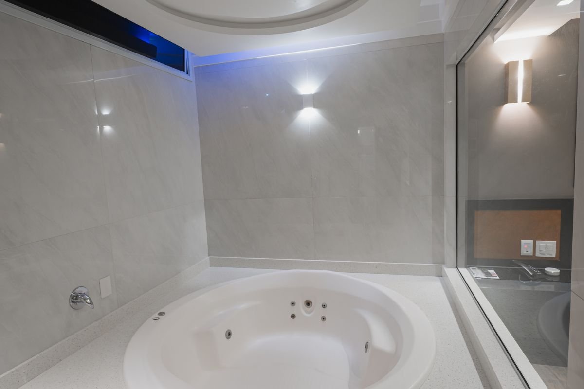 A ampla hidromassagem redonda de 1,80m convida ao relaxamento, enquanto a sauna úmida ajuda a aliviar o estresse e a tensão. A cama king size oferece o máximo conforto, e o espelho no teto acrescenta um toque de charme e sensualidade ao espaço.