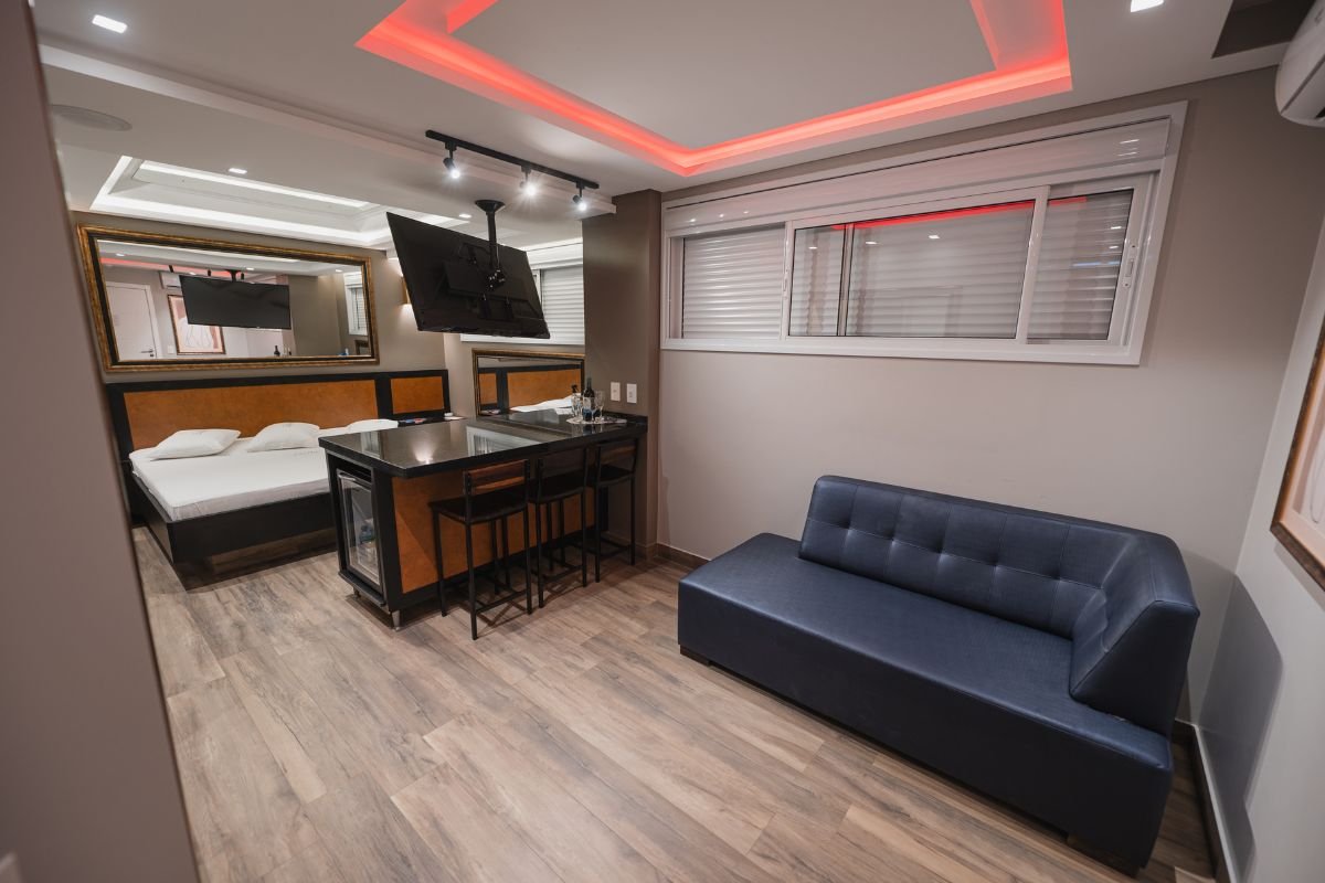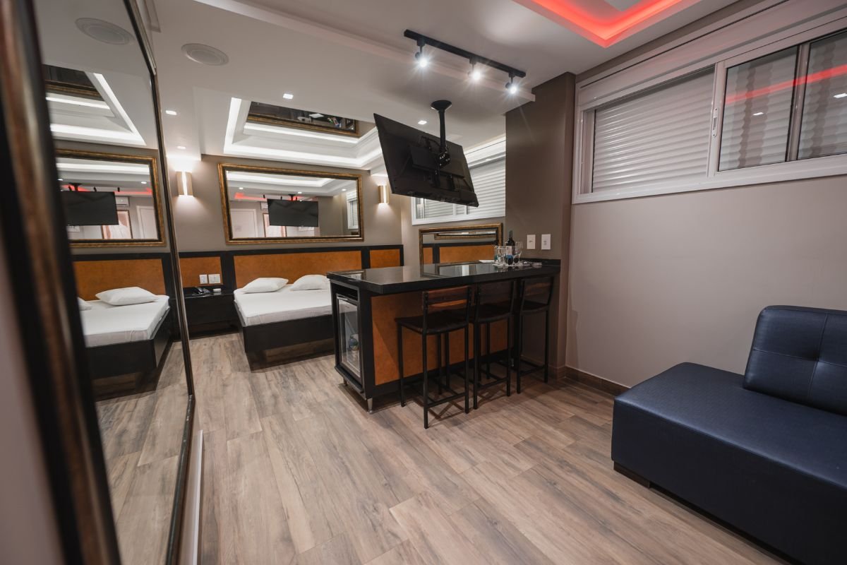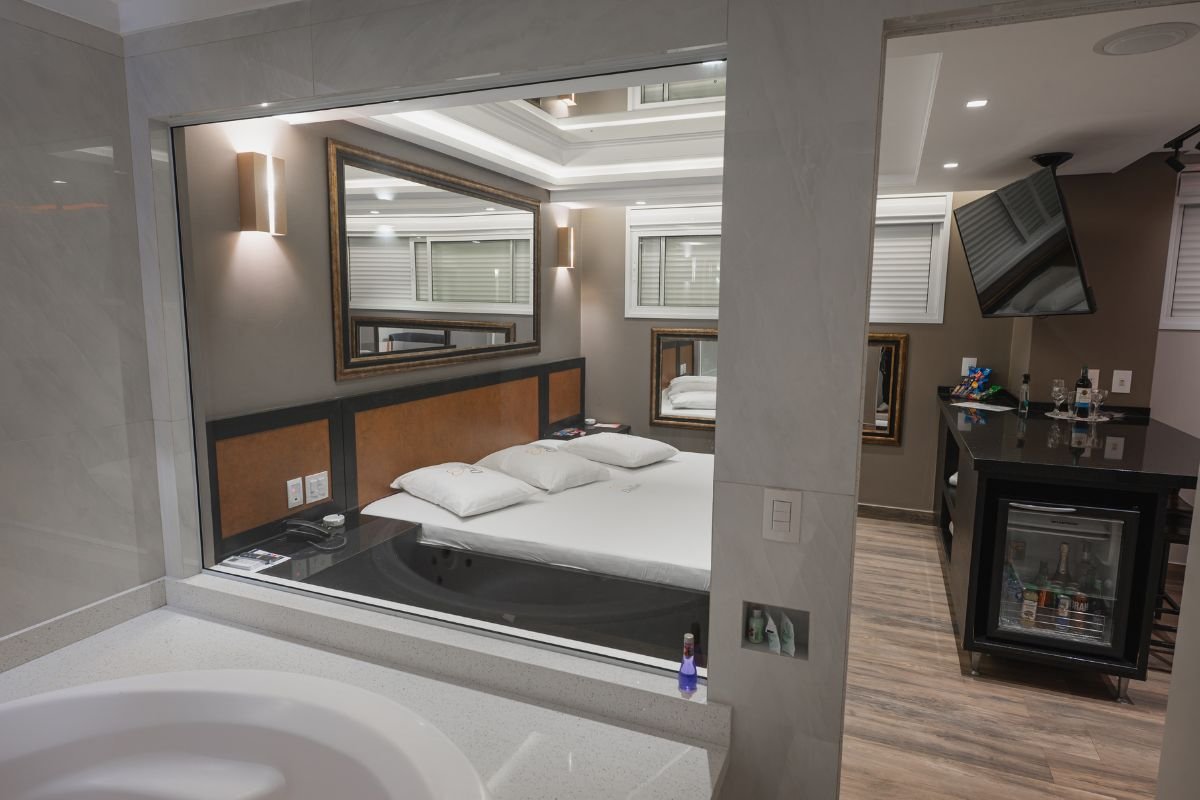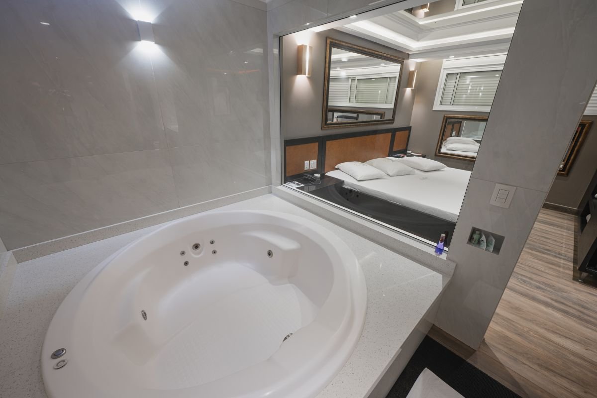 O ambiente conta com TV de 40 polegadas, frigobar, ar-condicionado e persianas motorizadas garantindo o clima ideal para relaxar. Para completar, a suíte dispõe de Wi-Fi gratuito e garagem privativa, assegurando bem-estar e discrição durante a estadia.