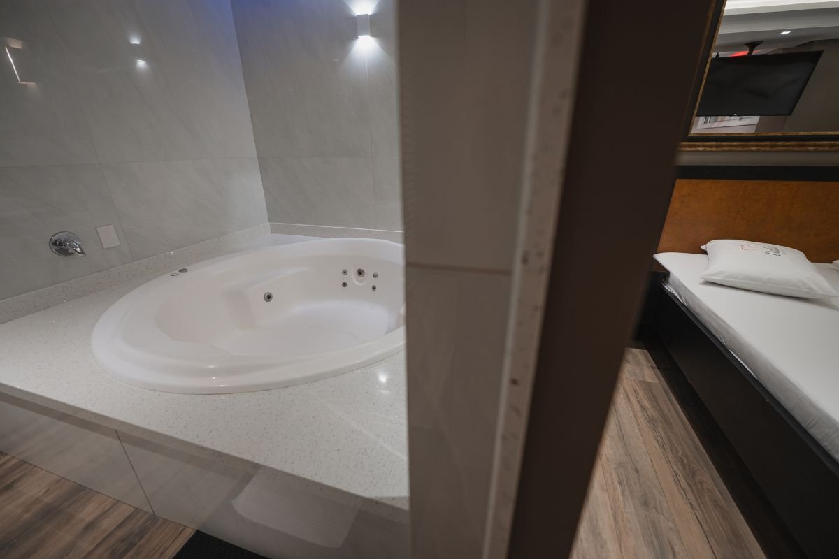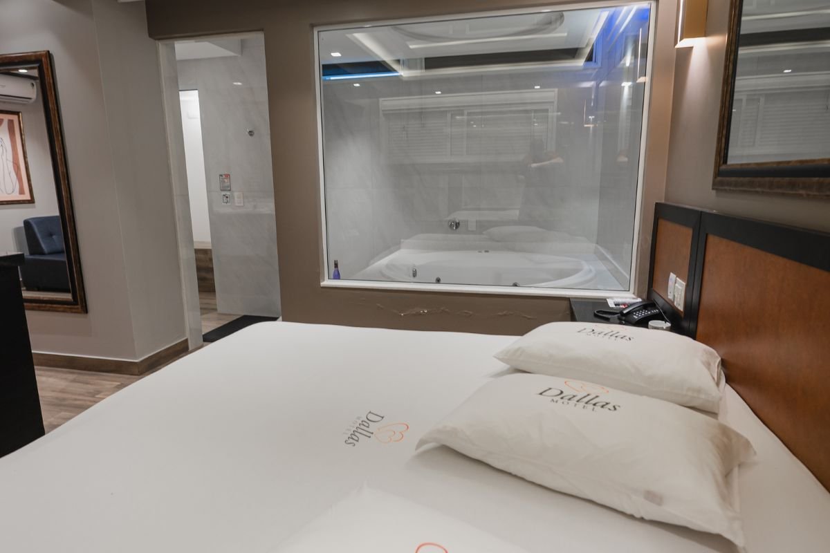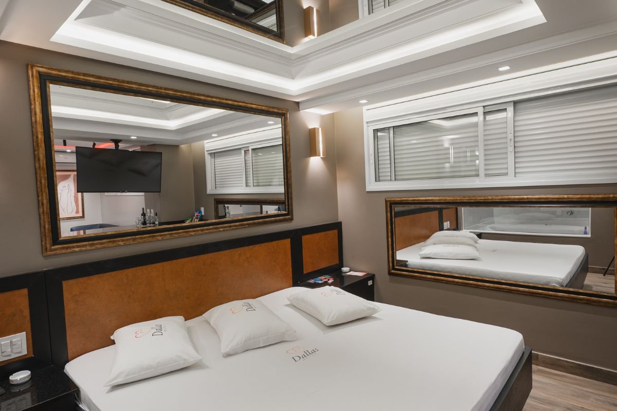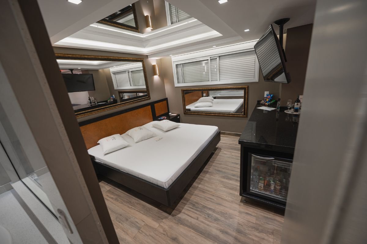 O ambiente conta com TV de 40 polegadas, frigobar, ar-condicionado e persianas motorizadas garantindo o clima ideal para relaxar. Para completar, a suíte dispõe de Wi-Fi gratuito e garagem privativa, assegurando bem-estar e discrição durante a estadia.